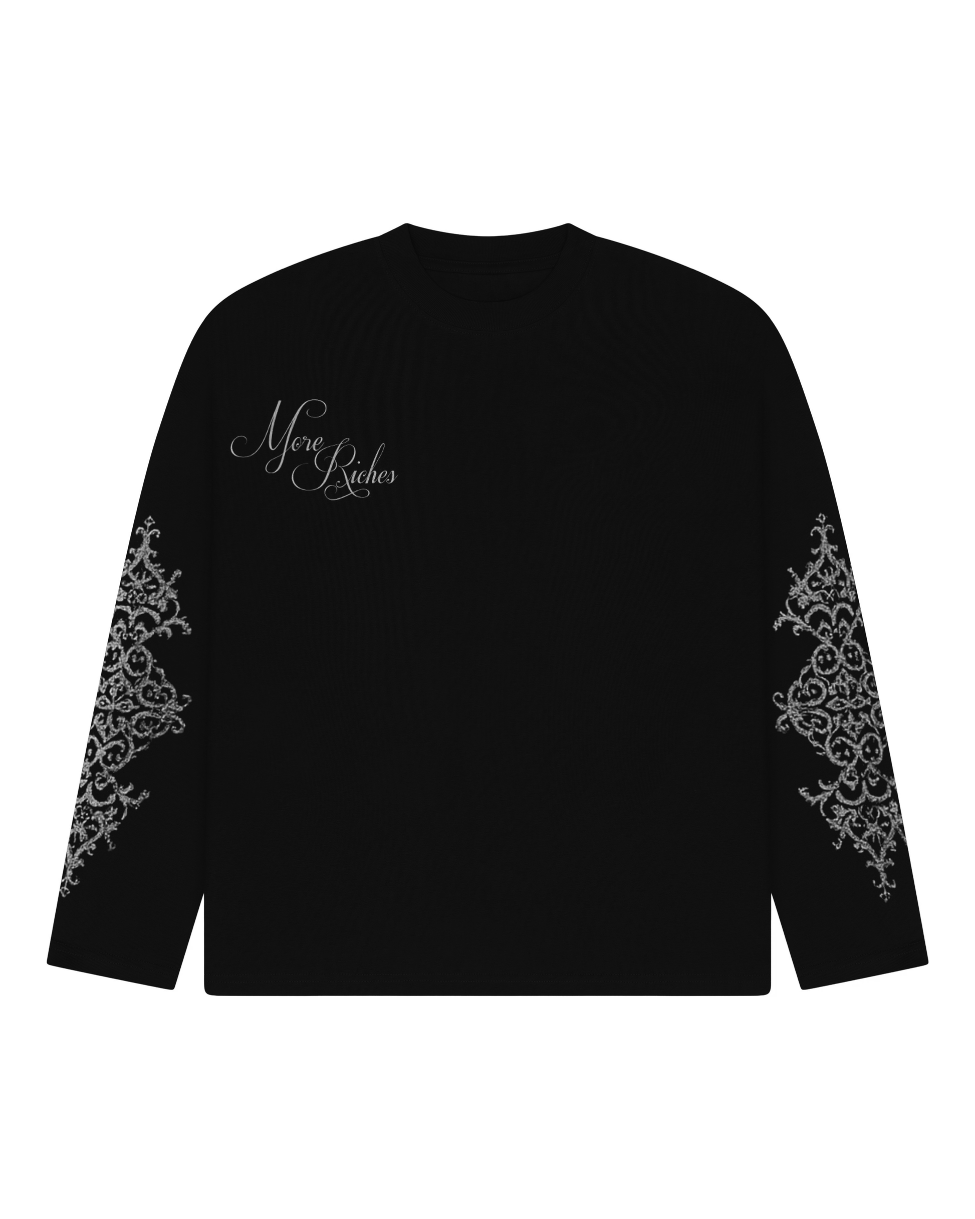 The MR25 Silverscript Long Sleeve delivers sleek streetwear with bold silver sleeve detailing and the iconic More Riches script. Clean, powerful, and built to stand out.
